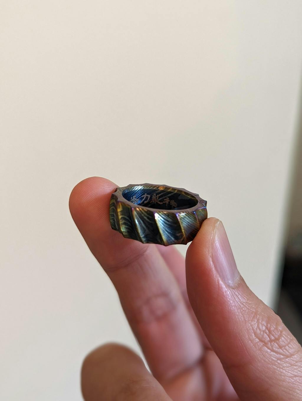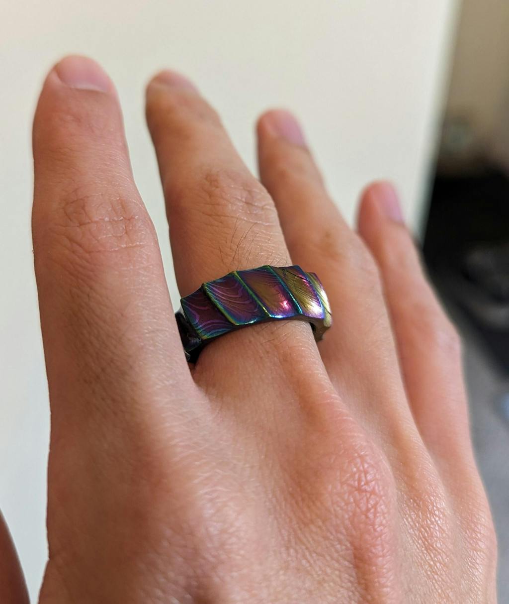 Our YAMATA NO OROCHI ring takes inspiration from the scales of the great serpent and the katana that was found within its flesh, culminating in a band of katana steel that shines with a multitude of iridescent colors. The metal is skillfully twisted by our smith to form ridges reminiscent of dragon scales before being coated in an alloy of titanium, gold, and platinum to acquire its vibrant aesthetic.
